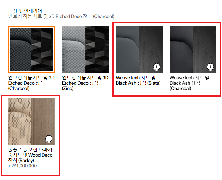 그래서 여기서 직물시트를 제외하고 인조가죽시트를 선택하려면 파일럿옵션과 플러스옵션을 선택해야합니다.