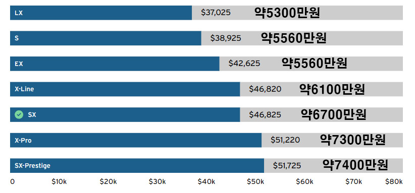 한국에 만약 나온다면 전혀 다른 트림이 나오겠지만 현재 미국이라면 SX 트림을 추천합니다.