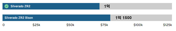 실버라도 ZR2는 가장 멋진 비오프로드 실버라도 1500 High Country보다 1400만원 이상으로 상당한 시작 가격을 가지고 있습니다.
