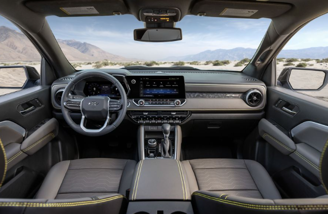 새로운 게이지 클러스터, 인포테인먼트 화면 및 스티어링 휠이 업데이트된 디자인을 완성합니다. 내부 사양은 전체 헤드룸이 마지막 픽업에 비해 1인치 감소했지만 레그룸과 어깨 공간은 거의 동일하다는 것을 보여줍니다. 새로운 2023년 모델은 또한 쉐보레가 콜로라도에서 선루프를 옵션 장비로 제공한 첫 번째 사례이기도 합니다.