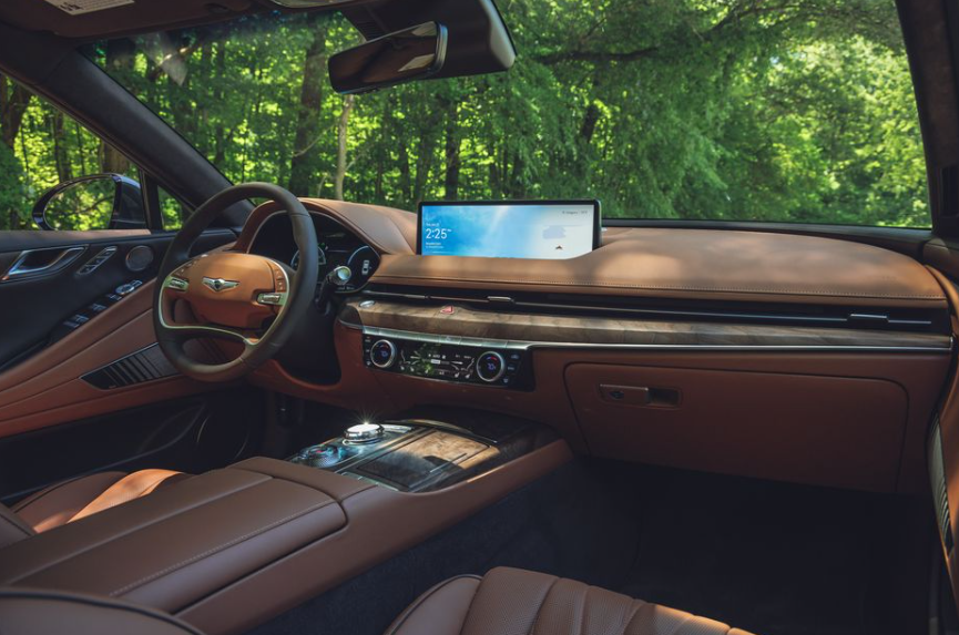 G80 전기차는 로드된 프레스티지 형태로만 제공되므로 부드러운 가죽 커버와 매력적인 목재 트림으로 꾸며져 있습니다.