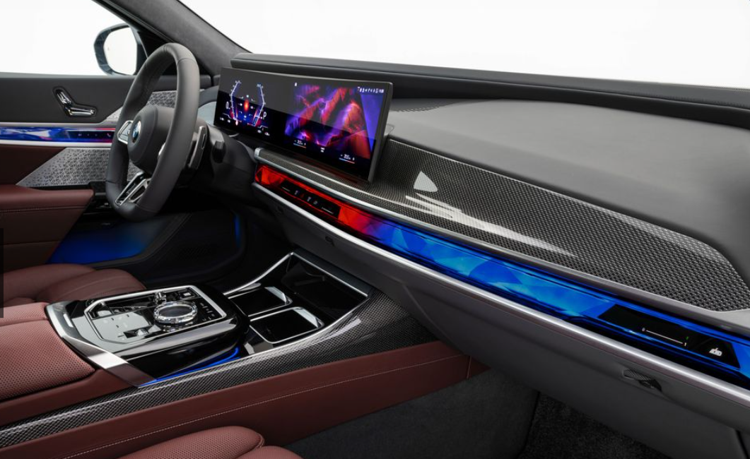 BMW 7시리즈는 인포테인먼트 터치스크린과 동일한 유리 패널 아래에 대형 디지털 게이지 디스플레이가 장착된 BMW iX SUV 와 동일한 대시보드 레이아웃을 사용합니다.